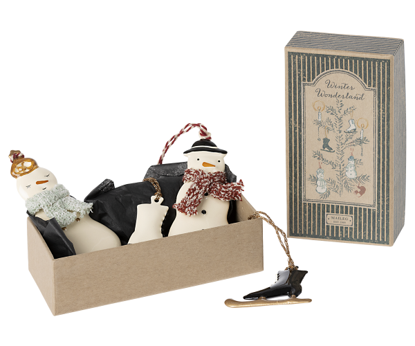 En perfekt gaveæske, der indeholder 4 smukke Maileg ornamenter. Hvert ornament er pakket ind i silkepapir og pakket i en gaveæske dekoreret med Dorthe Mailils tegninger. Dette sæt indeholder en snemand, hans kone og 2 skøjter.